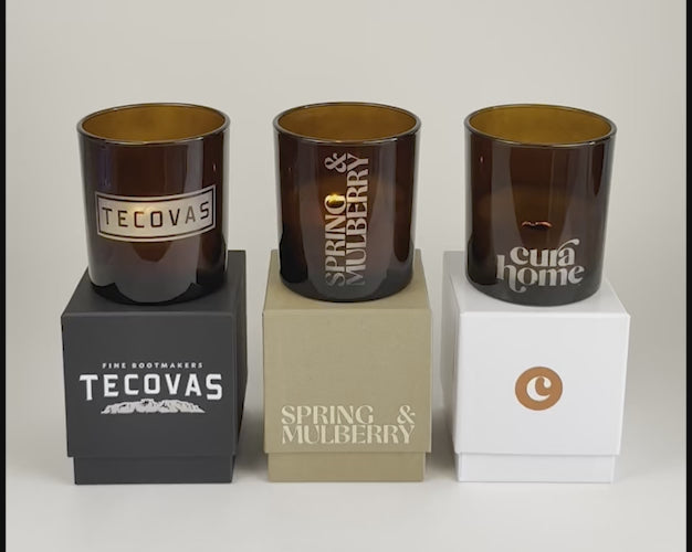 Define your brand with bold sophistication using our 14 oz. Black Glass Candle, custom printed in full-color. The matte black vessel provides a dramatic backdrop for your artwork, allowing vibrant logos and detailed designs to stand out with striking clarity. Each candle is filled to order with our eco-friendly soy-blend wax, available in over 90 signature fragrances, and finished with a natural crackling wooden wick. Elevate your presentation with optional branded wooden lids and premium two-piece gift boxes. Made in the USA.