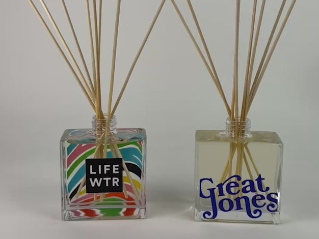 Elevate your brand with our luxurious custom reed diffusers - sleek, elegant, and designed to make a statement. The matte-black 8 oz. vessel provides an eye-catching canvas for your branding, whether printed in crisp white, vibrant full-color, or a refined tone-on-tone effect. Each diffuser is hand-filled with your choice from over 90 premium scents, offering a sophisticated custom fragrance diffuser experience. Whether ordered for a branded campaign, event, or executive suite, these promotional reed diffusers deliver a distinctive, scent-driven expression of your brand.