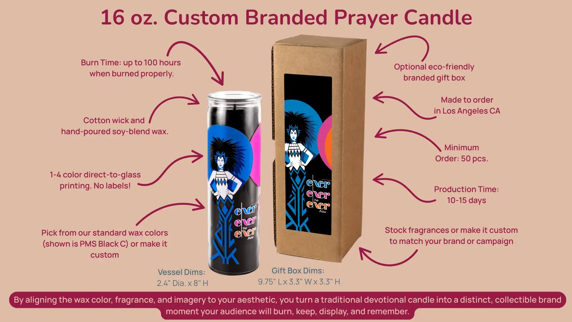 The minimum order for our custom printed prayer candles is 50 units. Standard production time is 10–15 business days after artwork approval. Rush production and wholesale pricing are available depending on order size and timing.