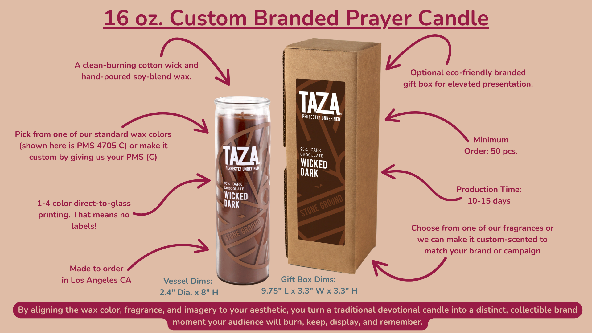 Our 16 oz. Custom Prayer Candle is hand-poured in Los Angeles and personalized with your logo or artwork printed directly onto the glass using high-definition, label-free 4-color direct printing. This style features brown wax that can be custom-scented to match your brand or campaign, with optional branded gift boxes for elevated presentation. Ideal for brand activations, merch drops, corporate gifting, and special events. Minimum Order: 50 units