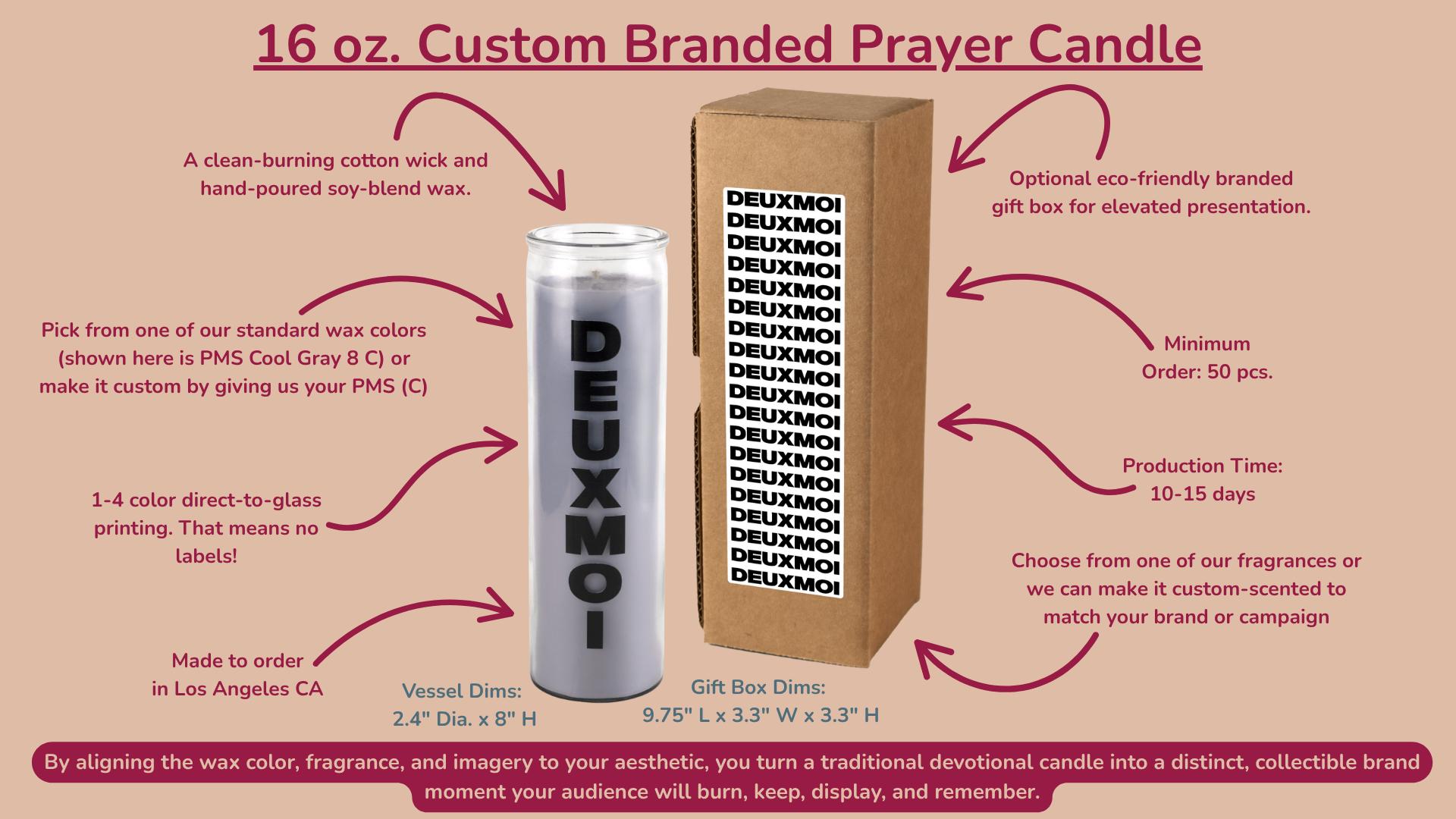 Our 16 oz. Custom Prayer Candle is hand-poured in Los Angeles and personalized with your logo or artwork printed directly onto the glass using high-definition, label-free 4-color direct printing. This style features gray wax that can be custom-scented to match your brand or campaign, with optional branded gift boxes for elevated presentation. Ideal for brand activations, merch drops, corporate gifting, and special events. Minimum Order: 50 units