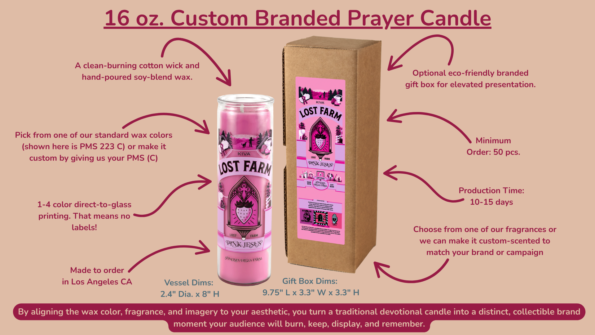 Our 16 oz. Custom Prayer Candle is hand-poured in Los Angeles and personalized with your logo or artwork printed directly onto the glass using high-definition, label-free 4-color direct printing. This style features pink wax that can be custom-scented to match your brand or campaign, with optional branded gift boxes for elevated presentation. Ideal for brand activations, merch drops, corporate gifting, and special events. Minimum Order: 50 units