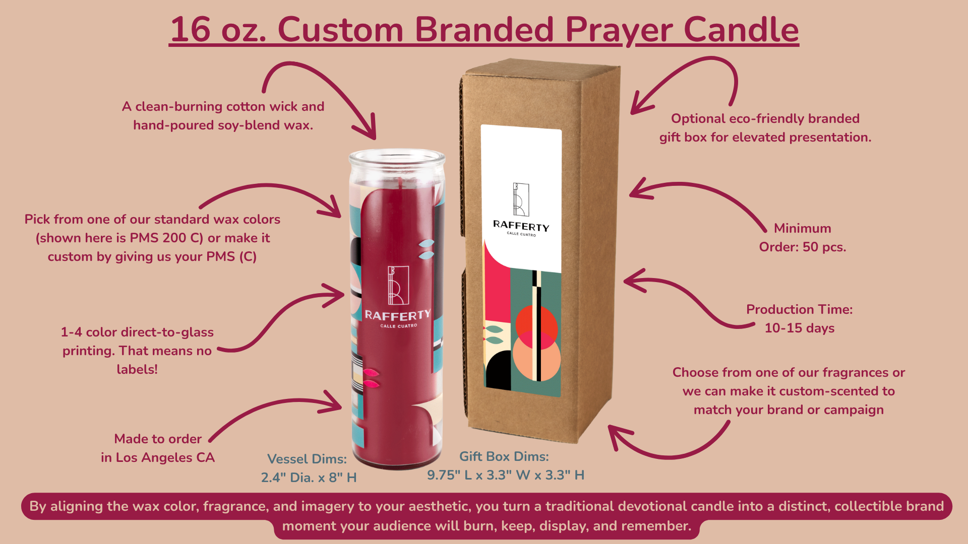 Our 16 oz. Custom Prayer Candle is hand-poured in Los Angeles and personalized with your logo or artwork printed directly onto the glass using high-definition, label-free 4-color direct printing. This style features red wax that can be custom-scented to match your brand or campaign, with optional branded gift boxes for elevated presentation. Ideal for brand activations, merch drops, corporate gifting, and special events. Minimum Order: 50 units