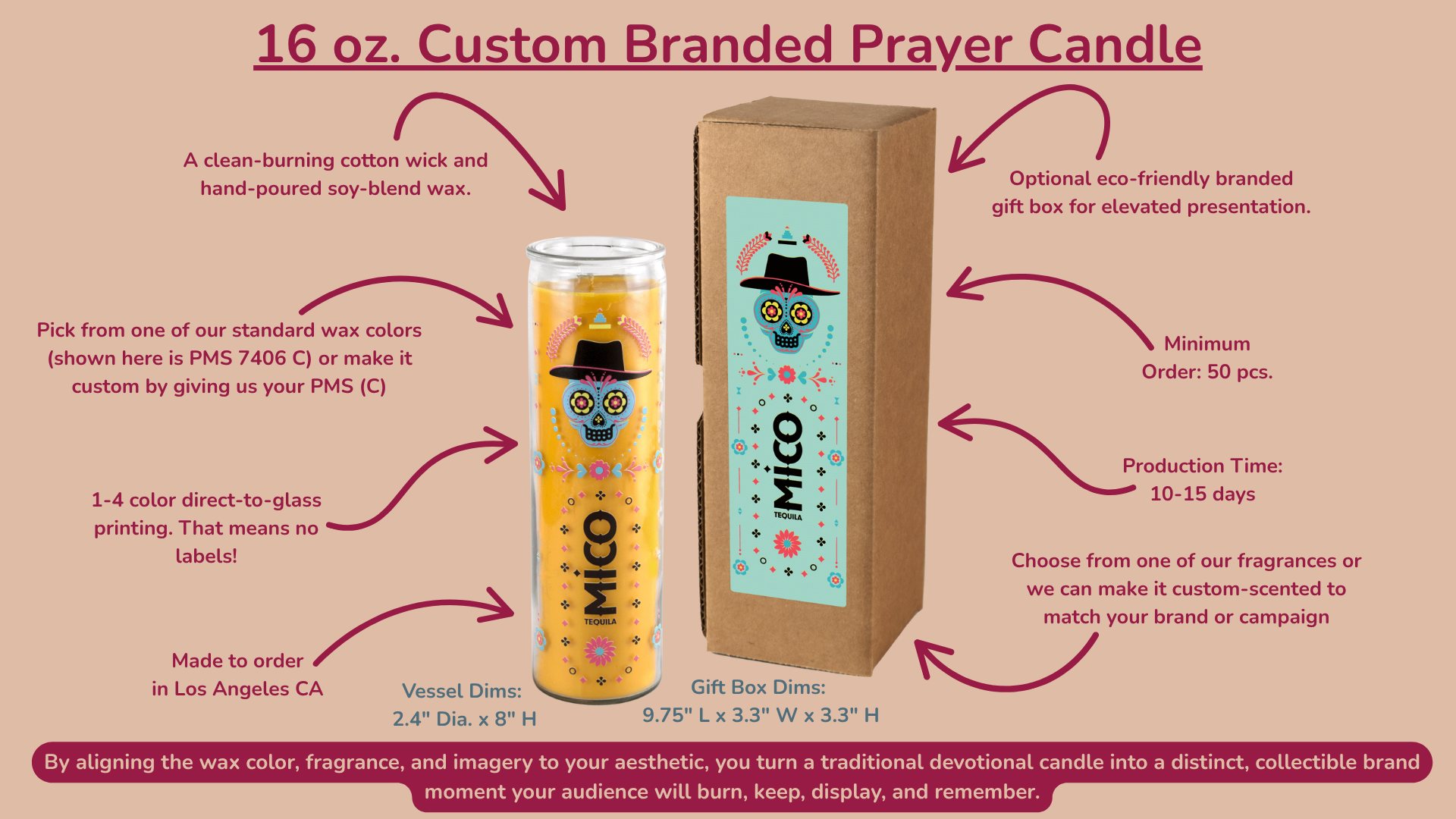 Our 16 oz. Custom Prayer Candle is hand-poured in Los Angeles and personalized with your logo or artwork printed directly onto the glass using high-definition, label-free 4-color direct printing. This style features yellow wax that can be custom-scented to match your brand or campaign, with optional branded gift boxes for elevated presentation. Ideal for brand activations, merch drops, corporate gifting, and special events. Minimum Order: 50 units